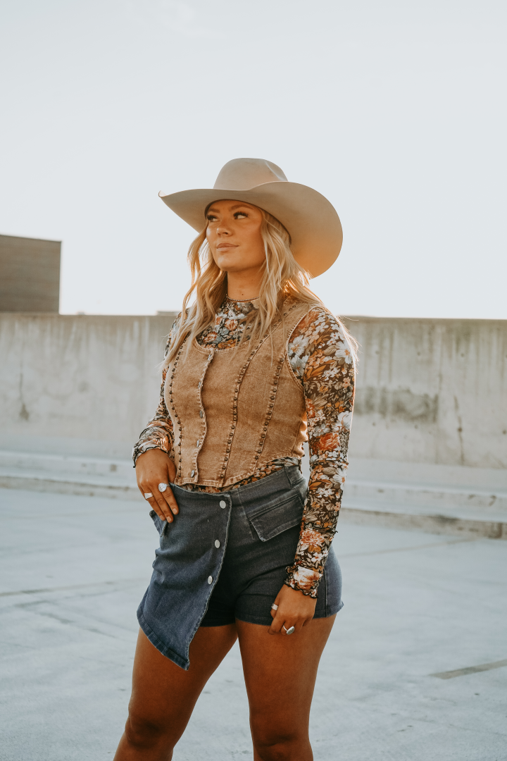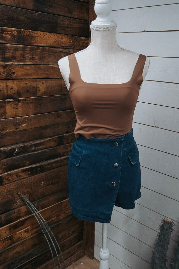 Elevate your style with this mesmerizing high-waisted knit denim skort, featuring functional pockets. This skirt offers both comfort and durability. Its classic design is perfect for casual outings or dressing up, making it a versatile addition to any wardrobe. Perfect for any fashion enthusiast.