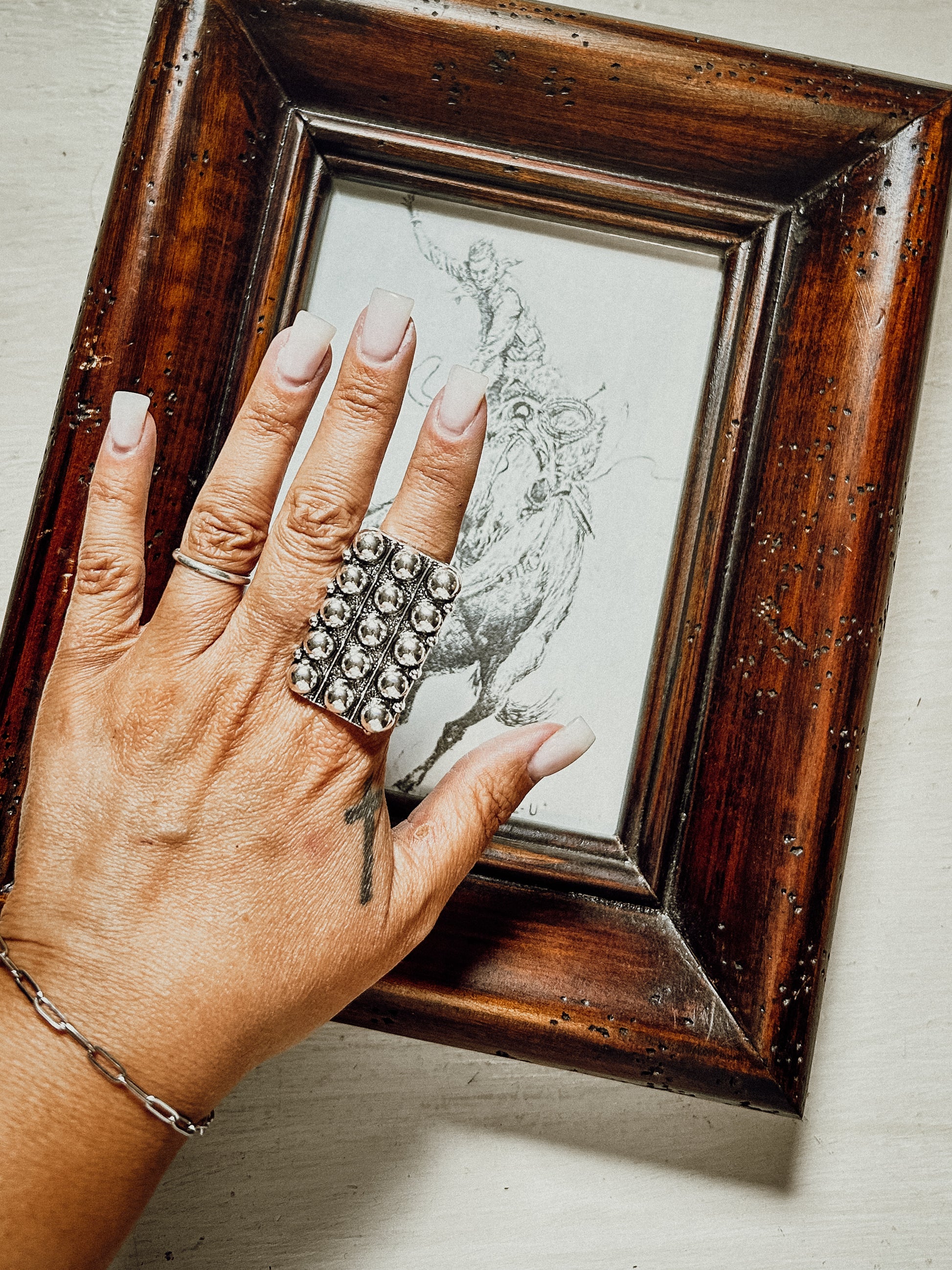 Add a touch of western charm to your style with this playful rectangle bubble cuff ring. Its unique shape and bubbly texture make it a fun statement piece that’s perfect for everyday wear or special occasions. Embrace a little wild spirit with this eye-catching accessory!