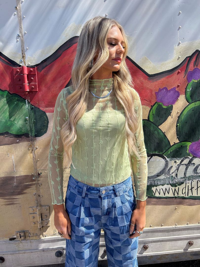The Lariat Lace top, featuring a mock neck style and intricate cactus lace design, exudes elegance and sophistication. The included green cami adds a pop of color and completes the ensemble.