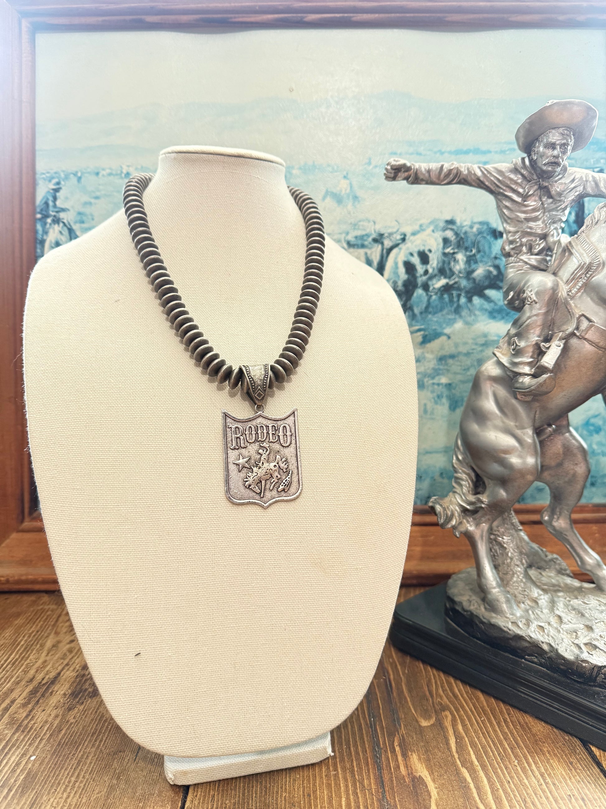 Add a touch of Southwestern charm to your look with Maggie, a playful 24-inch necklace featuring shimmering silver faux Navajo pearl beads and a bold silver metal Rodeo pendant. Perfect for adding sparkle and personality to any outfit!