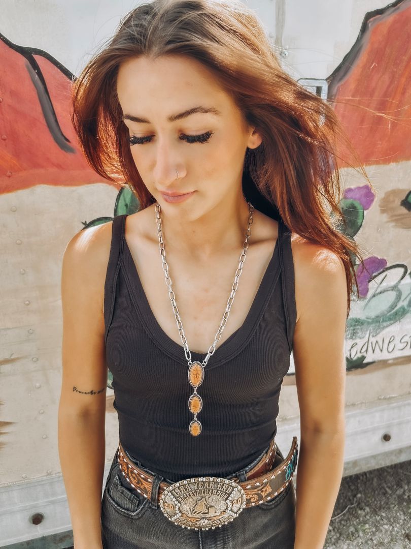 This necklace is a WOW! Three vibrant orange stones, each carefully set to catch the light and draw attention. This exquisite piece adds a pop of color to any outfit, making it perfect for both casual outings and elegant events.