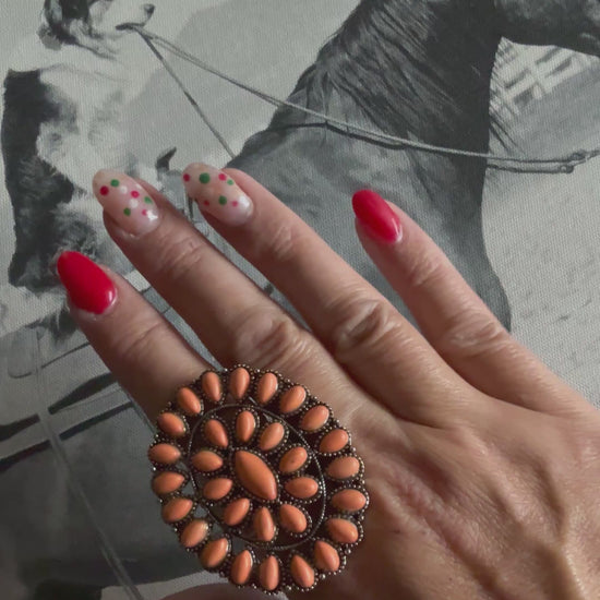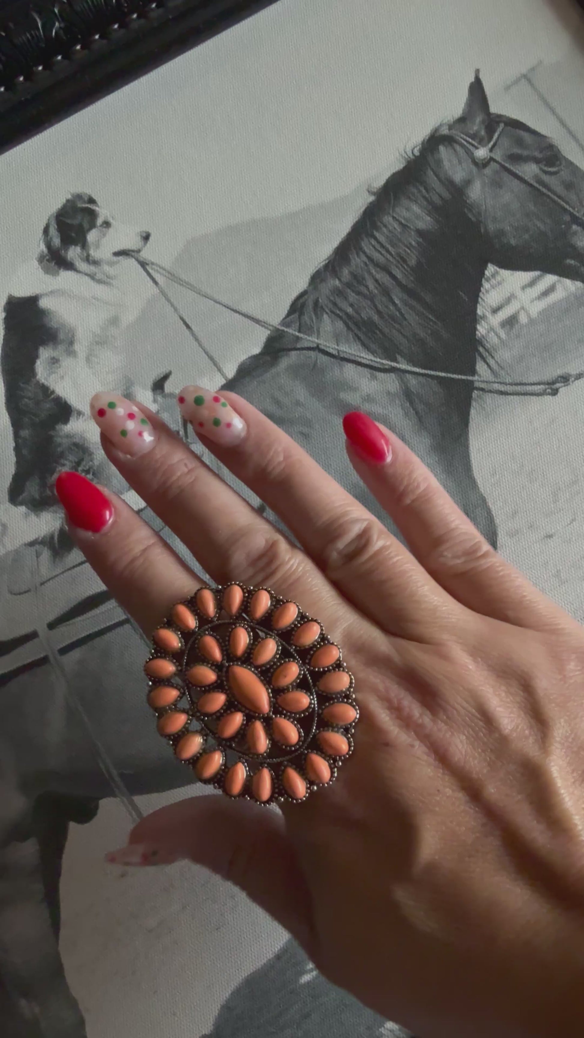 Make a bold western statement with the Copper Canyon Concho Stretch Ring. This stunning cocktail ring features an intricately detailed silver-tone concho setting adorned with vibrant orange stones arranged in a beautiful layered cluster design. At the center, a bold oval stone anchors the piece, while surrounding stones radiate outward for rich texture, dimension, and unmistakable western charm.
