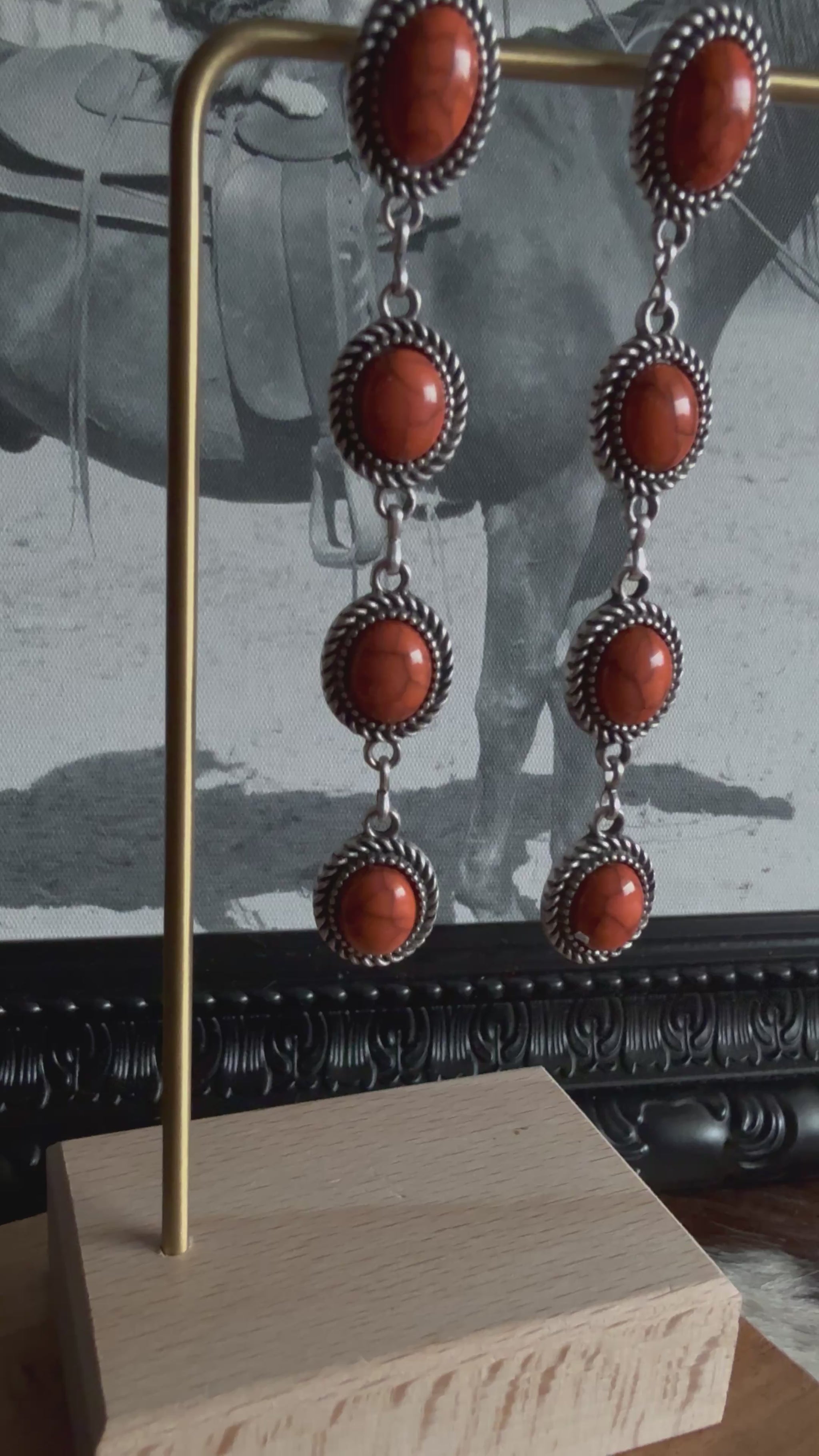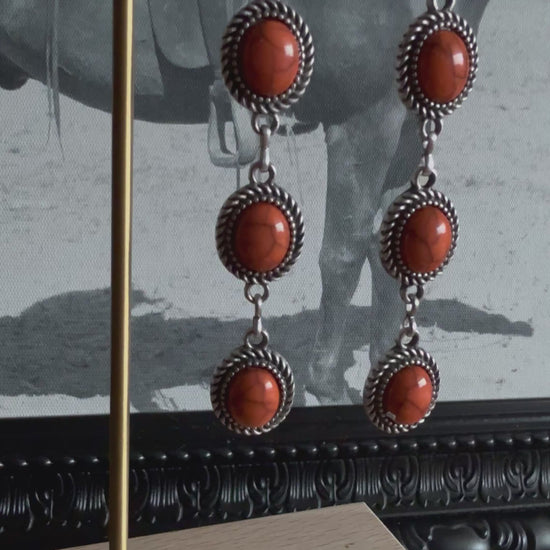 Turn heads with these show-stopping 4-Tier Orange Stone Dangle Earrings, designed to add bold western charm to any outfit. Each tier features a vibrant orange stone framed with oxidized silver detailing, creating movement, texture, and serious statement style with every step you take.