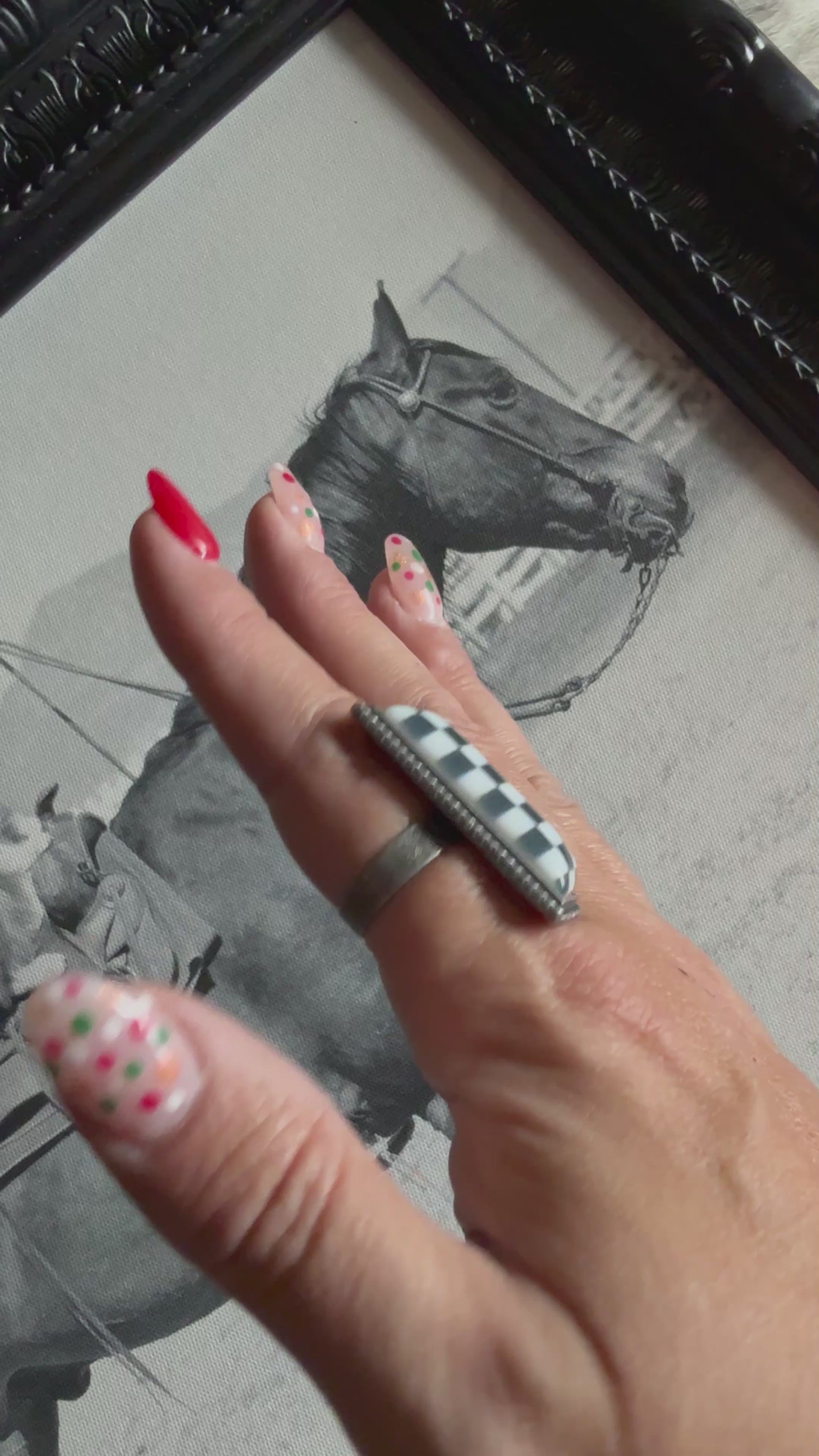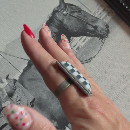 Turn heads with bold, modern western flair in the Midnight Checkered Statement Ring. This striking cocktail ring features a sleek rectangular bar design accented with an eye-catching black-and-white checker pattern, framed in textured silver-tone detailing for the perfect blend of edgy style and western charm.